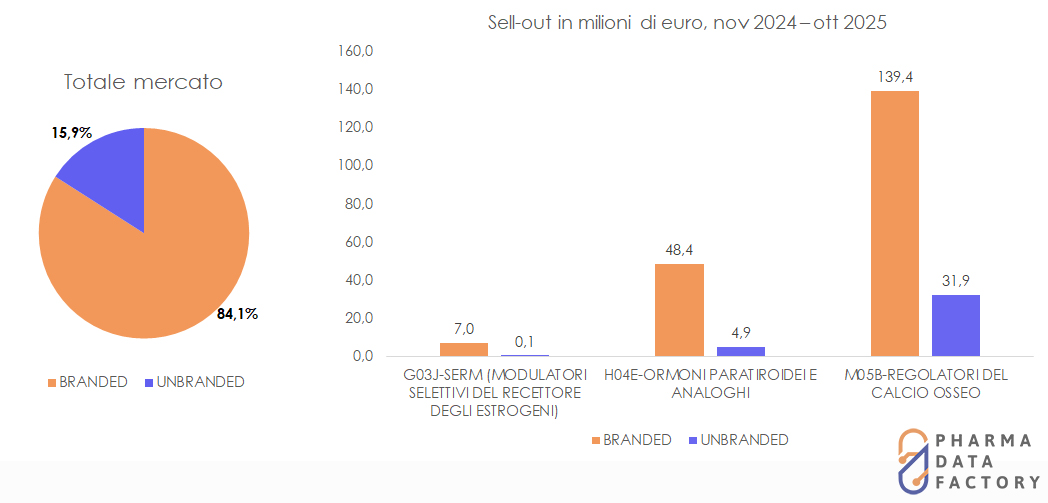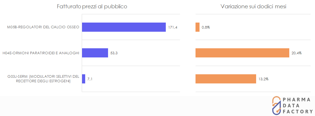 Il segmento, dice ancora Pharma Data Factory, si divide in tre classi Atc: regolatori del calcio osseo (M05BB), ormoni paratiroidei e analoghi (H04E) e Serm (modulatori selettivi del recettore degli estrogeni), che si spartiscono l’intero fatturato della categoria.
