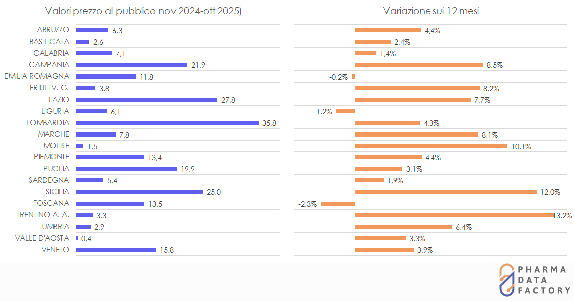 I consumi territoriali (a valori) non fanno emergere casi particolarmente significativi, con le differenze tra le varie regioni che sembrano addebitabili soprattutto al peso della popolazione anziana. Gli andamenti tendenziali, invece, mostrano progressioni eterogenee: tra le regioni più grandi, crescono sensibilmente i consumi in Sicilia e Campania ( +12 e +8,5% rispettivamente, sempre nel confronto sui 12 mesi), mentre in Lombardia e Toscana avanzano in modo più contenuto o addirittura regrediscono (+4,3 e -2,3%). Tra le regioni più piccole, si distinguono per incremento Trentino Alto Adige, Molise e Friuli Venezia Giulia.