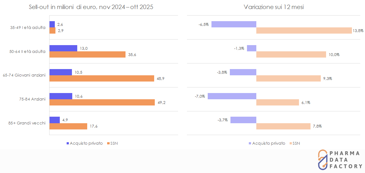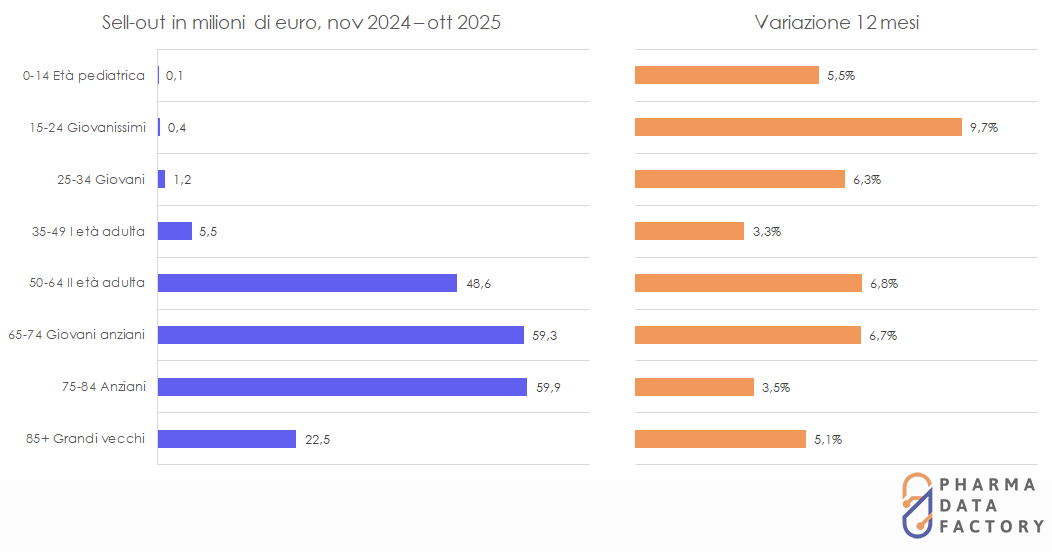 Come già accennato in apertura, la fetta principale della spesa per questi farmaci si concentra nelle fasce più anziane della popolazione, le più giovani (fino ai 49 anni) che mettono assieme consumi a valori per non più di 7,2 milioni di euro (su un totale di quasi 232). Per incremento sui dodici mesi, invece, la fascia che si distingue è quella dei 15-24enni (+9,7%), mentre le altre mostrano progressioni più o meno contenute.