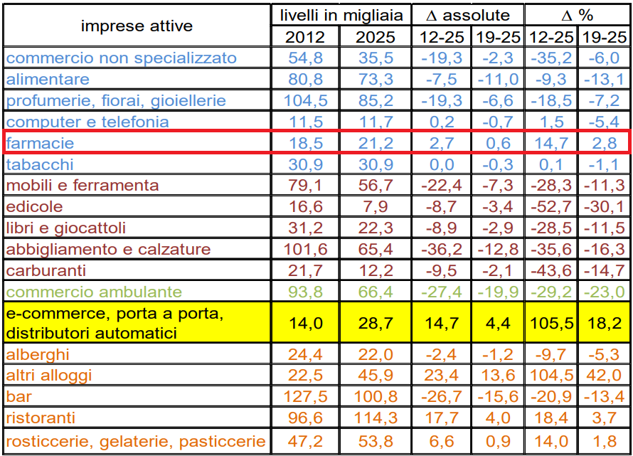 In questo scenario, il comparto delle farmacie rappresenta una delle poche eccezioni alla tendenza generale. Tra il 2012 e il 2025 le imprese classificate nella categoria che comprende farmacie, parafarmacie ed esercizi assimilati – secondo il codice Ateco di riferimento – risultano infatti in crescita del 9,8% nei centri storici e di circa il 14,7% su scala nazionale. Anche la densità per abitante aumenta leggermente, passando da 3,1 a 3,6 imprese ogni diecimila residenti. Si tratta tuttavia di dati che vanno letti con cautela, perché – come precisa la stessa indagine nelle avvertenze metodologiche – il codice statistico utilizzato comprende non soltanto le farmacie ma anche altre tipologie di esercizi di vicinato.