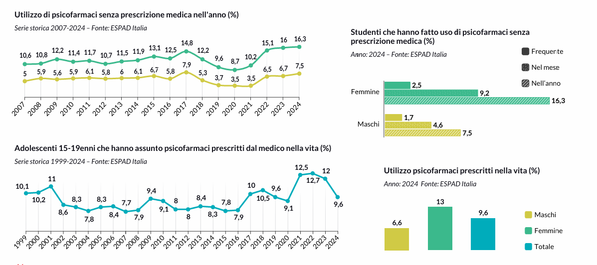 Cresce, tra gli adolescenti, l’uso di farmaci per finalità non terapeutiche: tra gli studenti di scuola superiore, il 21% ha assunto psicofarmaci o altri medicinali senza controllo medico almeno una volta (il 12% nell’ultimo anno) e la tendenza interessa molto di più le ragazze rispetto ai maschi (16,3% vs 7,5%). In particolare, le inappropriatezze riguardano soprattutto i farmaci dimagranti, il cui uso tra le adolescenti è circa triplo rispetto ai coetanei. Ma anche l’uso di psicofarmaci con ricetta è cresciuto: la quota di under 19 che li ha assunti almeno una volta è passata dall’8% circa del pre-pandemia al 12,7% del 2022, per poi calare al 9,6% nel 2024 ma anche in questo caso con prevalenza femminile.