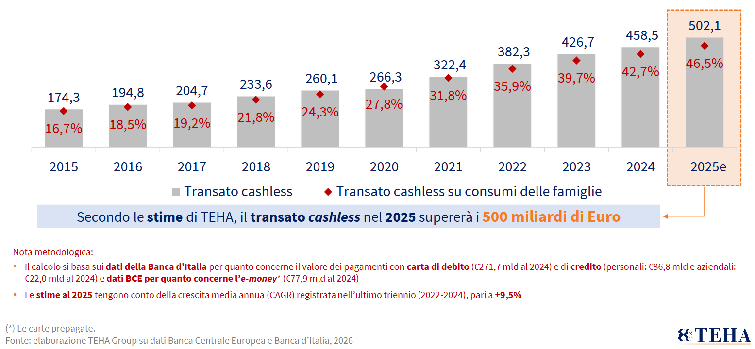 La diffusione del cashless è particolarmente evidente nelle spese ricorrenti, dove il digitale rappresenta ormai il 75,1% delle transazioni, con incidenze molto elevate per bollette (88,7%), affitti (85,6%) e ricariche telefoniche (80,7%). Anche sul piano macro la crescita è netta: il transato cashless ha superato i 500 miliardi di euro nel 2025 e rappresenta il 46,5% dei consumi delle famiglie, quasi triplicando rispetto al 2015.