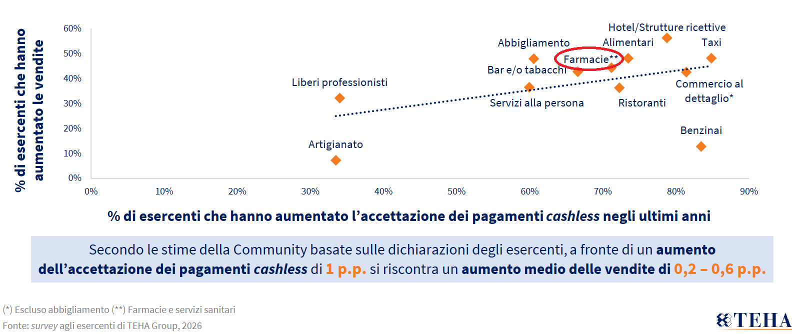 Per il retail, farmacia compresa, un’indicazione rilevante arriva dal lato dell’offerta: il 98% degli esercenti accetta pagamenti digitali, con un incremento di 19 punti percentuali in due anni. Non solo: circa sette operatori su dieci dichiarano che il cashless rappresenta oltre la metà del proprio fatturato e un esercente su due teme di perdere clienti se smettesse di accettarlo. La correlazione con le vendite è esplicita: a ogni punto percentuale di aumento dell’accettazione corrisponde un incremento del fatturato compreso tra 0,2 e 0,6 punti .