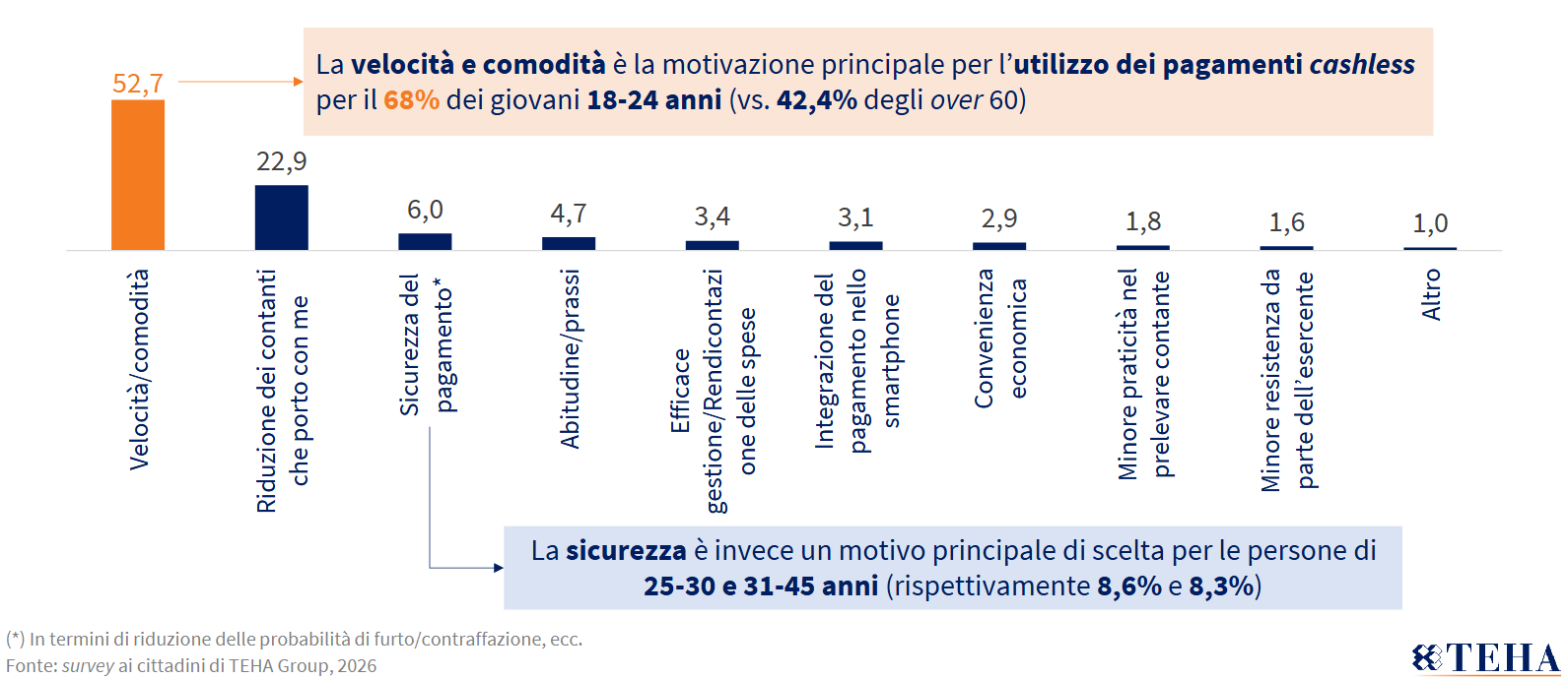 Nel complesso, il quadro che emerge è quello di una trasformazione ormai strutturale dei comportamenti di pagamento, con effetti diretti anche sulle dinamiche di vendita nei punti fisici. «L’evoluzione dei pagamenti digitali è in Italia una trasformazione strutturale che coinvolge l’intero ecosistema dei consumi e delle relazioni economiche», osserva Lorenzo Tavazzi, Senior Partner e Board Member di Teha Group. «La crescente diffusione del cashless nelle abitudini quotidiane dei cittadini rappresenta un segnale positivo di maturazione del sistema, ma mette al tempo stesso in luce la presenza di differenze ancora marcate tra settori, servizi e contesti d’uso».