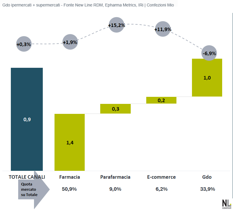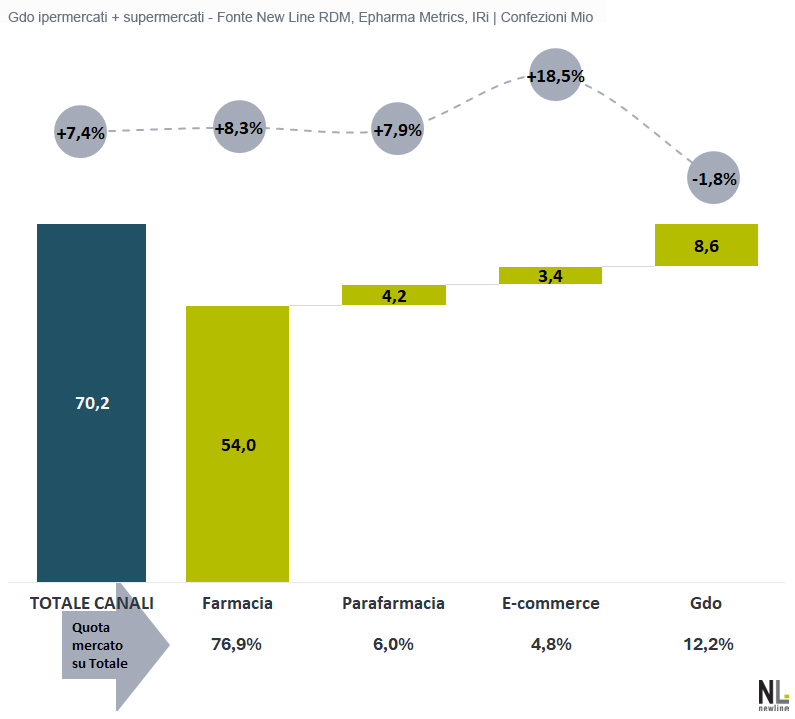 La farmacia, che in entrambi i panieri rimane il canale dal peso più rilevante, mostra un trend nettamente positivo per quanto concerne l’automedicazione (+11%) mentre nella dermocosmetica la crescita molto più contenuta (+0,5%). Sempre nell’automedicazione, riportano trend positivi a fatturato parafarmacia (+8,2%) e soprattutto e-commerce (+26,7%), mentre la performance del mass market è positiva ma di magnitudine inferiore (+0,7%).
