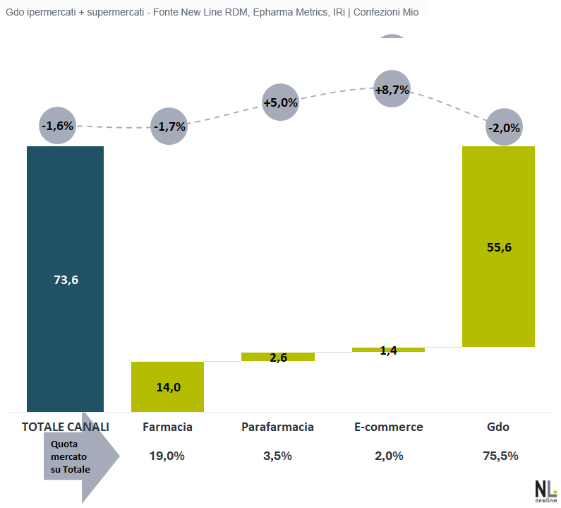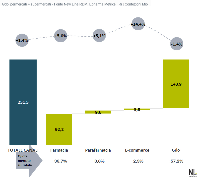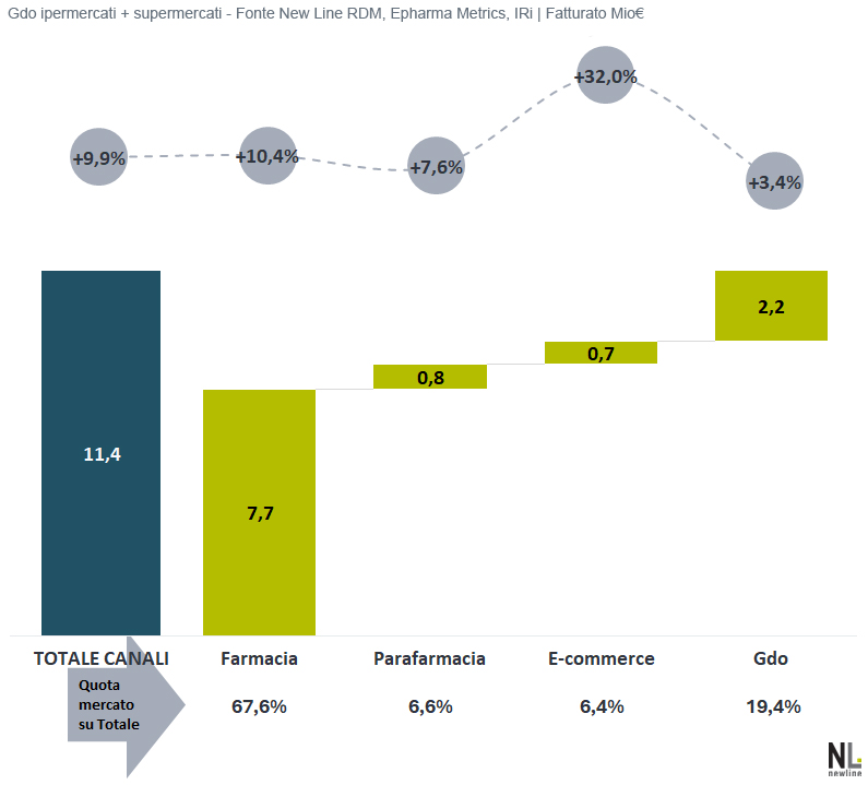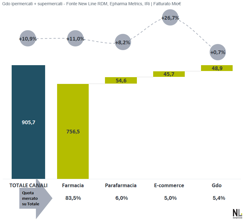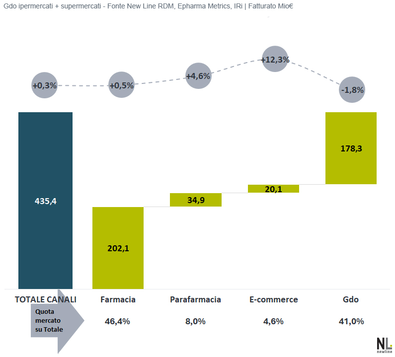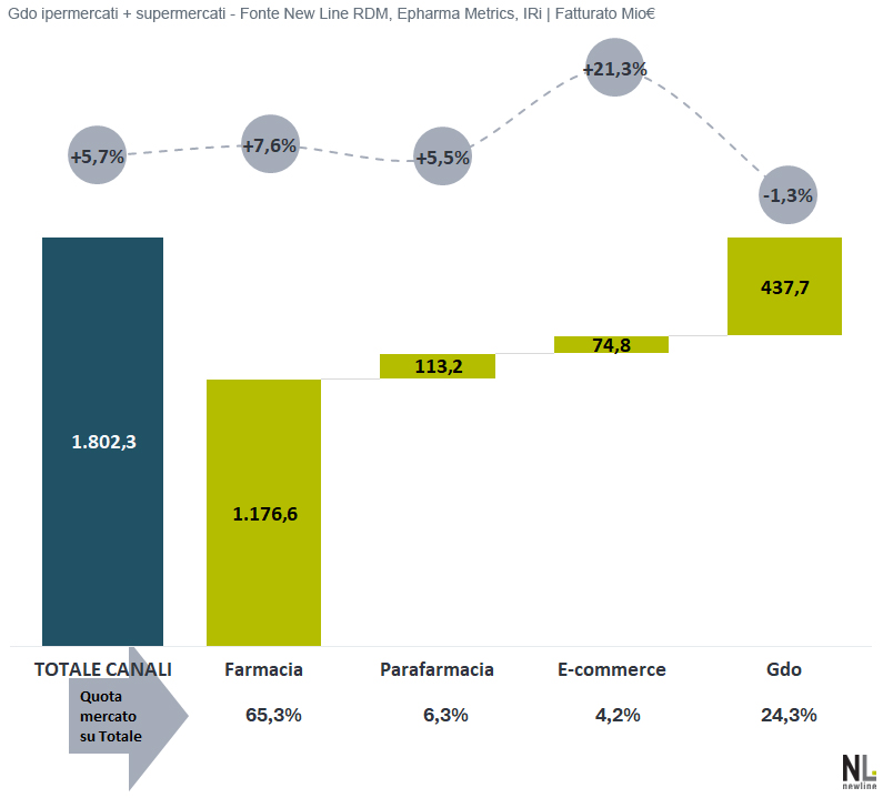 Rispetto a un fatturato complessivo che si aggira attorno a 1,8 miliardi di euro, dice New Line, la farmacia si assicura oltre il 65% del giro d’affari, in crescita del +7,6% rispetto allo stesso mese del 2024; segue a forte distanza la gdo, che rappresenta il 24,3% del comparto e a confronto con l’anno precedente mostra una contrazione del -1,3%; quindi la parafarmacia, che si assicura una quota del 6,3% e chiude il mese con +5,5% e infine il canale online, che si ferma a una market share del 4,2% ma rispetto riporta una crescita in doppia cifra (+21,3%).