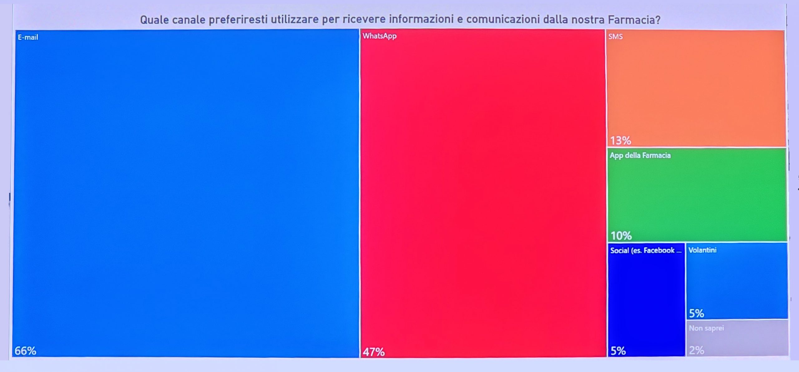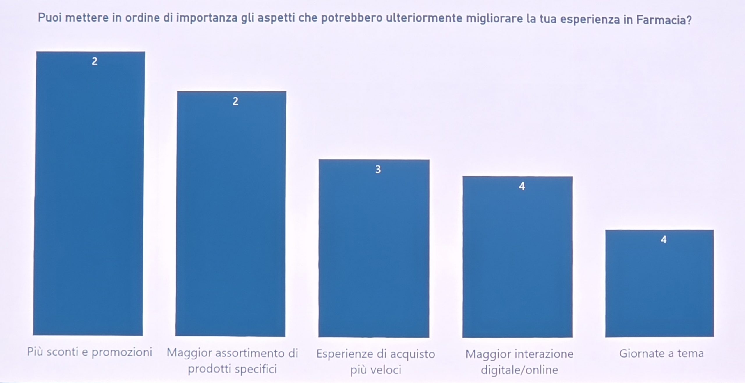 Per quanto concerne la shopping experience, invece, la richiesta dei clienti include un maggior numero di sconti e promozioni, più assortimento di prodotti specifici e un’esperienza di acquisto più veloce. Non manca qualche piccola sorpresa: alla richiesta di indicare quali sono i canali dai quali preferirebbe ricevere comunicazioni e aggiornamenti dalla sua farmacia, il 66% del campione indica l’e-mail e il 47% WhatsApp, a conferma di una digitalizzazione che ormai è penetrata in profondità anche nelle fasce meno giovani della popolazione.