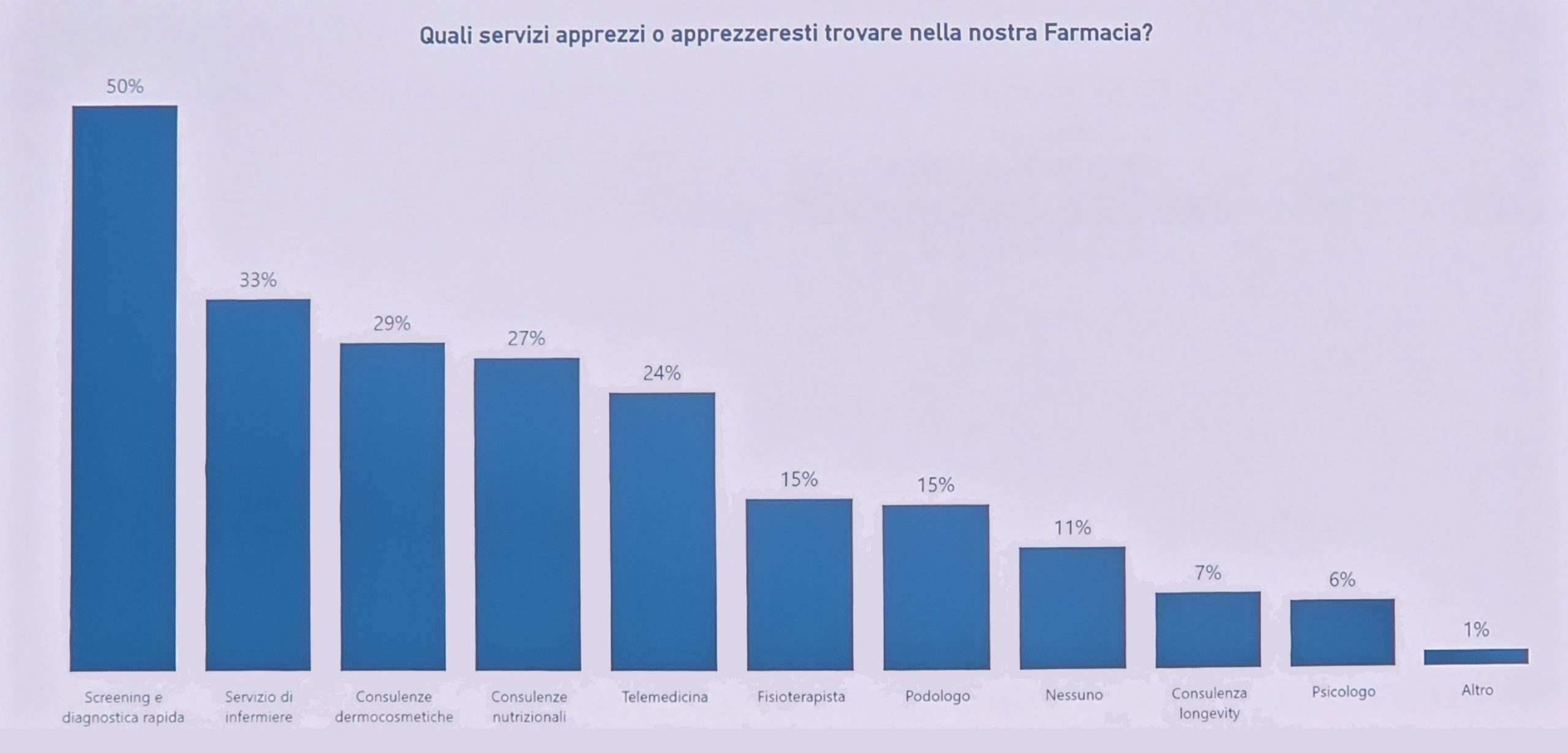 Una domanda che è in continua evoluzione, come rivela il sondaggio condotto da Unifarco su 650 farmacisti del network e oltre 5.800 consumatori finali, poi analizzato nei dati finali da Jakala. In tema di servizi, per esempio, un cliente su due apprezza o vorrebbe trovare nella sua farmacia screening e test di diagnostica rapida, uno su tre il servizio infermieristico, il 29% le consulenze dermocosmetiche e il 27% quelle nutrizionali.