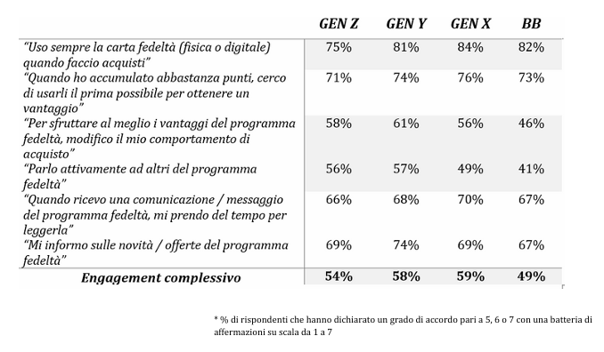 L’indagine analizza anche il grado di engagement con il programma fedeltà, misurato attraverso una serie di comportamenti che vanno dal semplice utilizzo della carta quando si paga fino alla ricerca proattiva di informazioni su offerte e novità. È la Generazione X a risultare complessivamente la più coinvolta, con uno scarto di circa dieci punti percentuali rispetto ai Baby Boomers. Tutti, indipendentemente dall’età, dichiarano di usare rapidamente i punti accumulati per ottenere vantaggi, mentre Millennials e Gen X sono i più attivi nel passaparola. La Generazione Y si distingue inoltre per una maggiore disponibilità a modificare le proprie abitudini d’acquisto pur di massimizzare i benefici del programma, seguita dalla Gen Z; i Baby Boomers appaiono invece i meno influenzabili sotto questo profilo.
