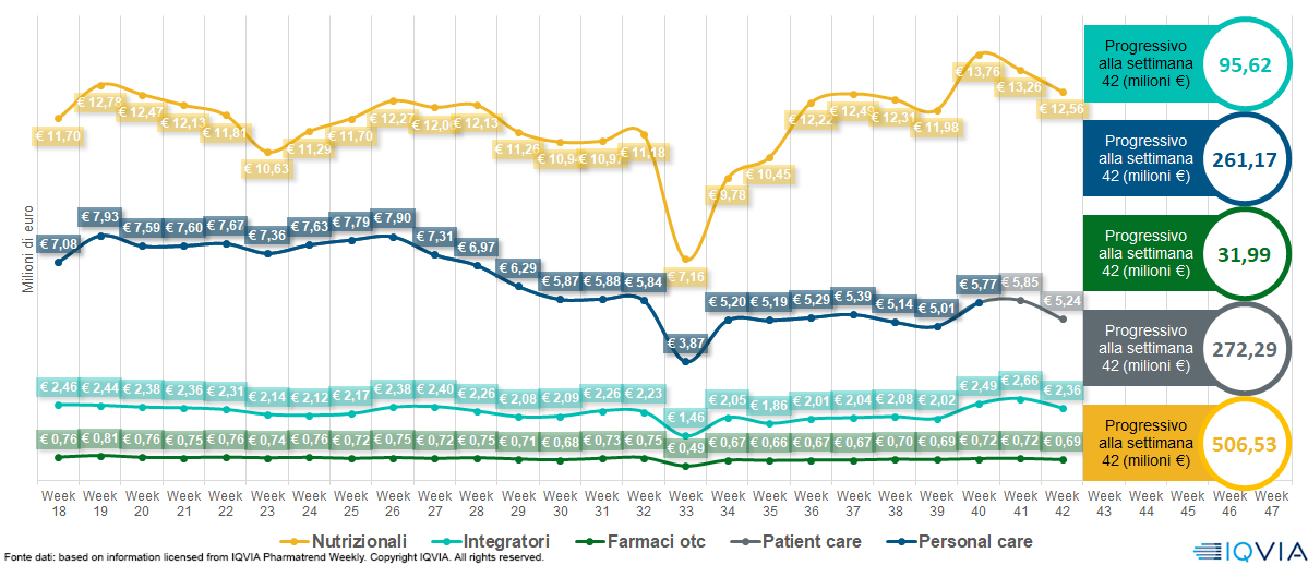 Tra i panieri del mercato, prosegue il momento di difficoltà del cura persona, che nella settimana perde sull’anno oltre 9 punti tanto a valori quanto a volumi e azzera quasi del tutto la crescita sul cumulato annuo (fatturato +0,2%, confezioni -0,5%). Gli integratori invece restano il paniere più rilevante, con una crescita cumulata che a valori arriva al 13,3% e al 6,6% (per oltre 31 milioni di confezioni vendute). Più indietro i farmaci di automedicazione, con poco più di 95,6 milioni di euro (+17,5%, ancora in rallentamento) e 11,7 milioni di confezioni (+14,3%). Tra le altre categorie fanno ancora bene i prodotti per urologia e sistema riproduttivo e i veterinari.