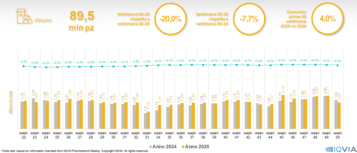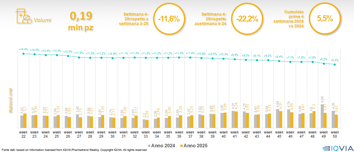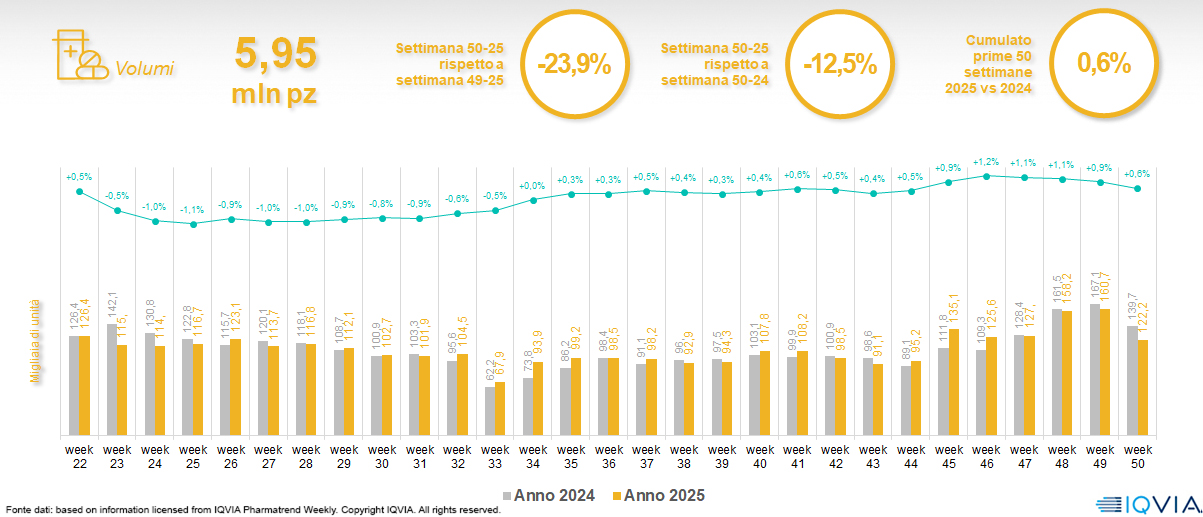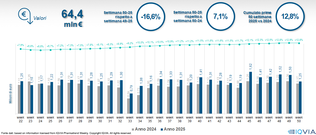 • Otc-Sop in crescita sui sette giorni, pressoché invariato il cumulato annuo. Nella settimana 50 il paniere dei farmaci di automedicazione mostra un incremento a valori e volumi (+13,7 e +4,3% rispettivamente) che però non incide sul progressivo 2025 (comunque in netta crescita: +16,7% nel giro d’affari e +13,2% nelle confezioni vendute).