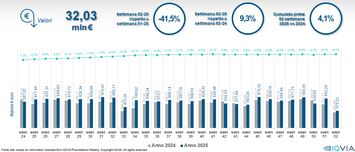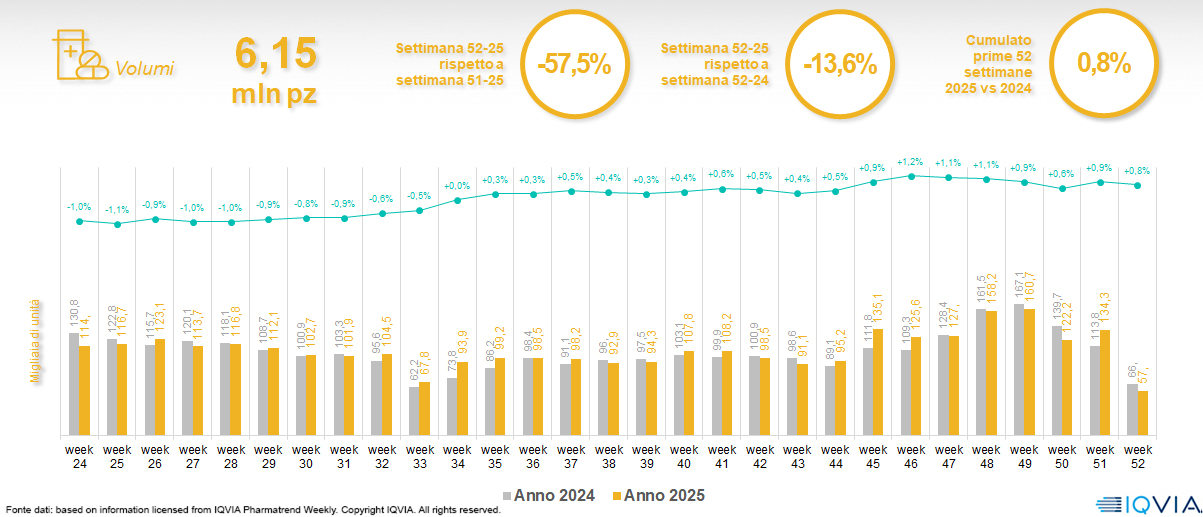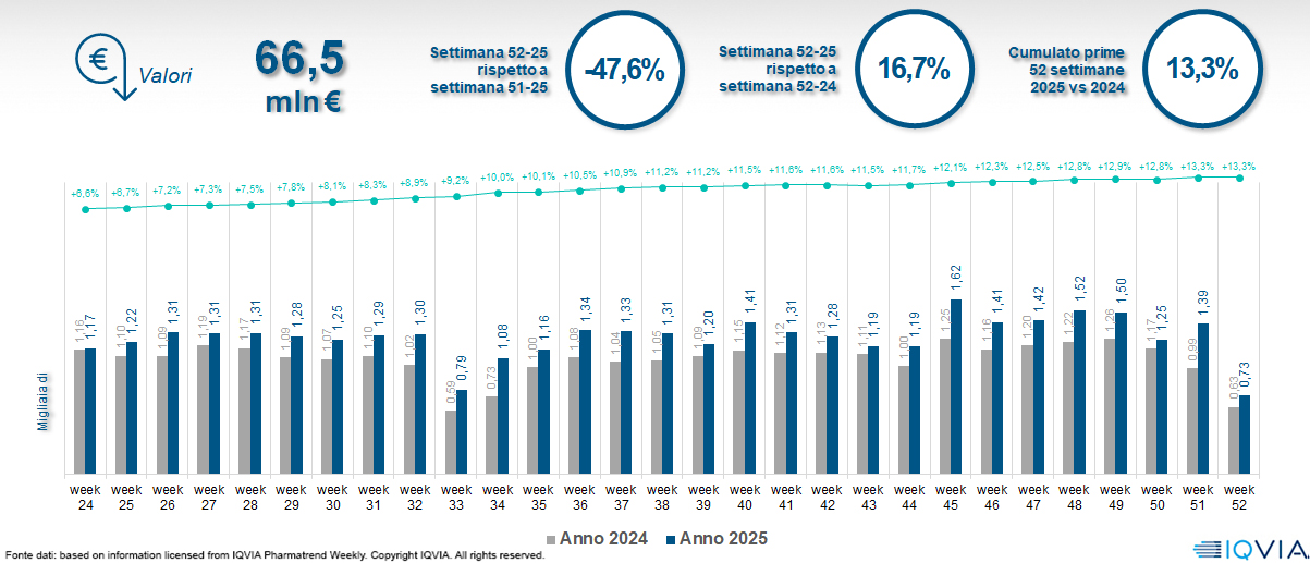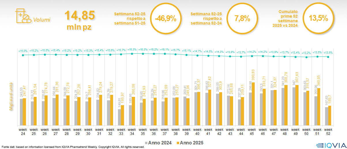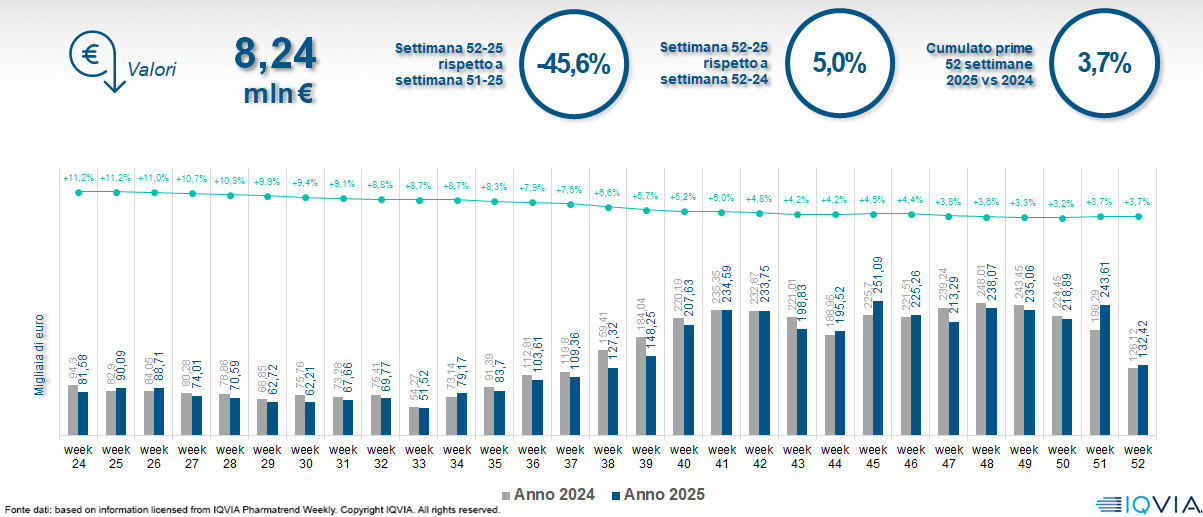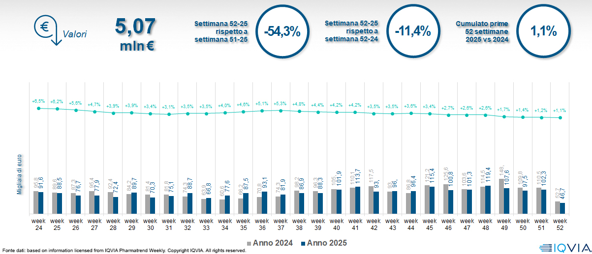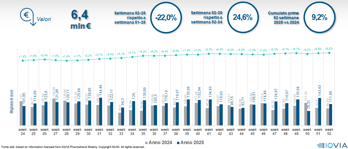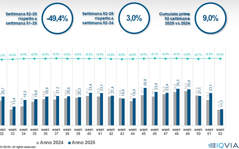 • Farmaci Otc-Sop: nel 2025 prestazioni di tutto rilievo per il comparto, che chiude i 12 mesi con un fatturato in crescita di quali il 17% e volumi anch’essi in positivo (+13,5%). A spingere, nelle ultime settimane di dicembre, è stata ovviamente la stagionalità, dato che la fine dell’anno è coincisa in questa stagione con il picco influenzale.
