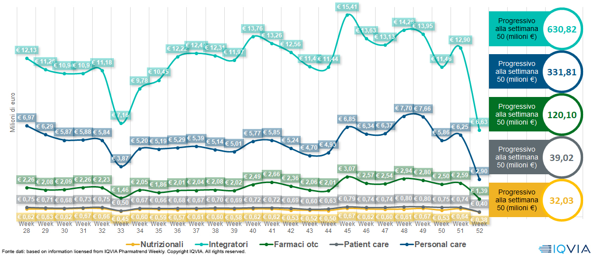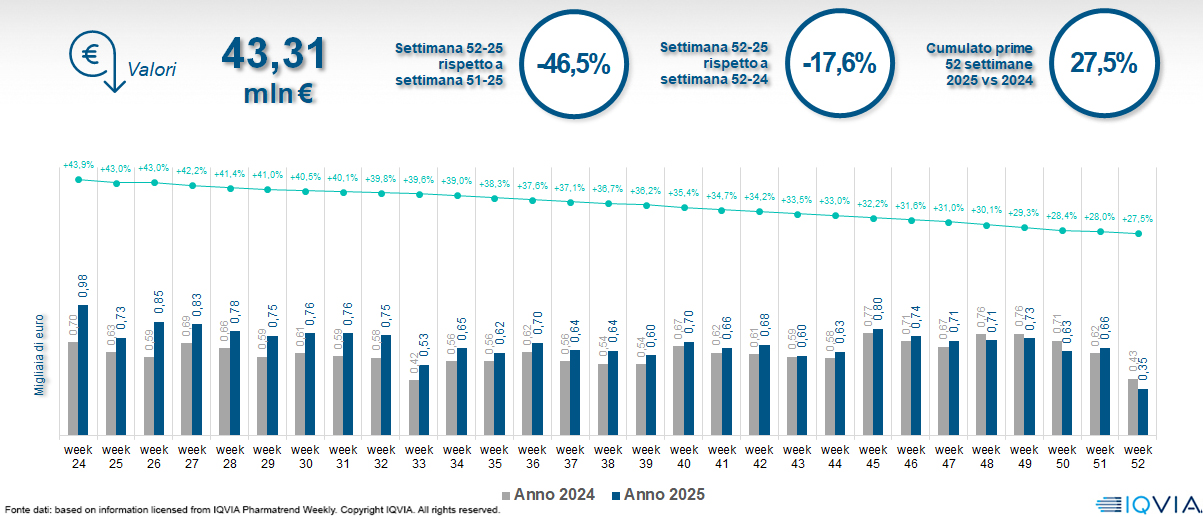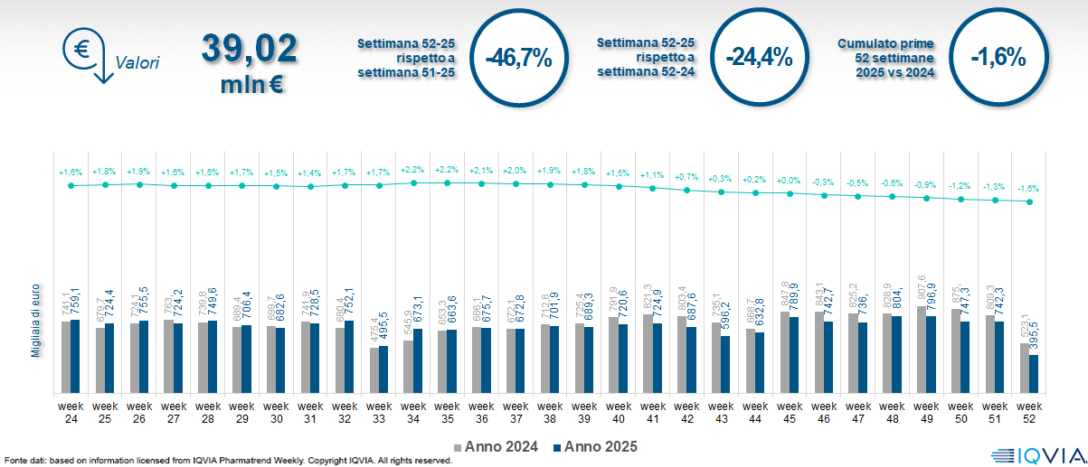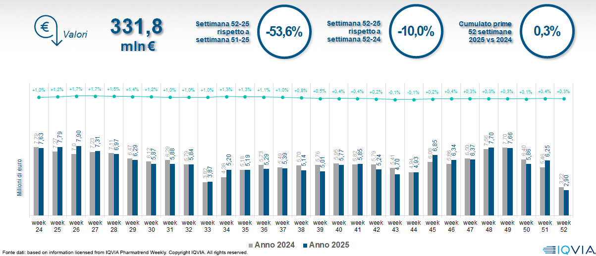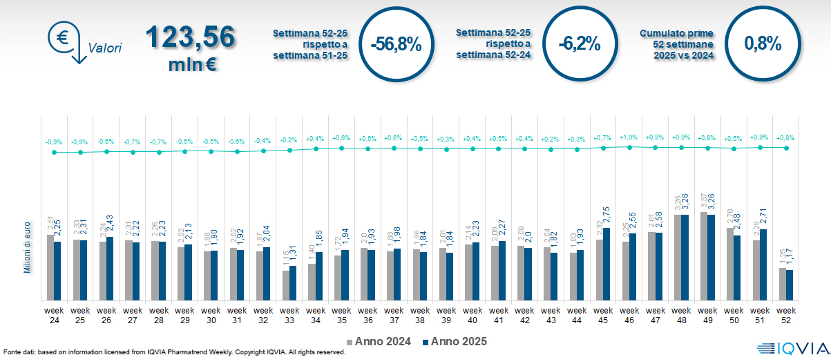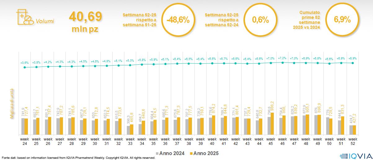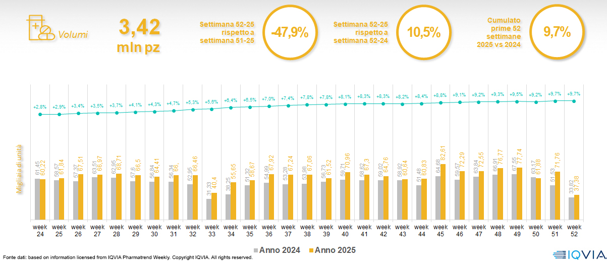 • Farmaci Otc-Sop: nel 2025 prestazioni di tutto rilievo per il comparto, che chiude i 12 mesi con un fatturato in crescita di quali il 17% e volumi anch’essi in positivo (+13,5%). A spingere, nelle ultime settimane di dicembre, è stata ovviamente la stagionalità, dato che la fine dell’anno è coincisa in questa stagione con il picco influenzale.