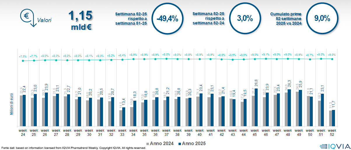 Anche se con qualche affanno a fine dicembre, il mercato online di farmacie e parafarmacie chiude il 2025 con un generoso segno più sia nei valori sia nei volumi. È quanto riferisce il report con cui Iqvia fotografa un anno di e-commerce dell’healthcare: in dodici mesi, il giro d’affari cresce del 9% e supera gli 1,1 miliardi di euro, per un totale di oltre 92 milioni di confezioni vendute (+4,2%).