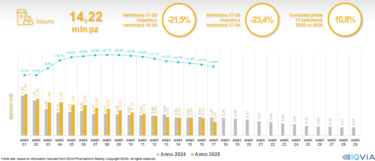 La doppia festività della 17ª settimana (Pasquetta più Festa della liberazione) costringe il mercato della farmacia a una brusca frenata, che incide anche per un punto percentuale in quasi tutti i segmenti, tanto a valori quanto a volumi, fatte alcune importanti eccezioni. È quanto riferisce il report con cui Iqvia aggiorna cifre e andamenti del canale alla settimana che va dal 21 al 27 aprile: in quattro mesi, il giro d’affari supera i 9 miliardi di euro (+4,9% rispetto allo stesso periodo del 2024, ma sette giorni prima era +6%) e le confezioni vendute sfiorano gli 812 milioni di pezzi (+0,8%).