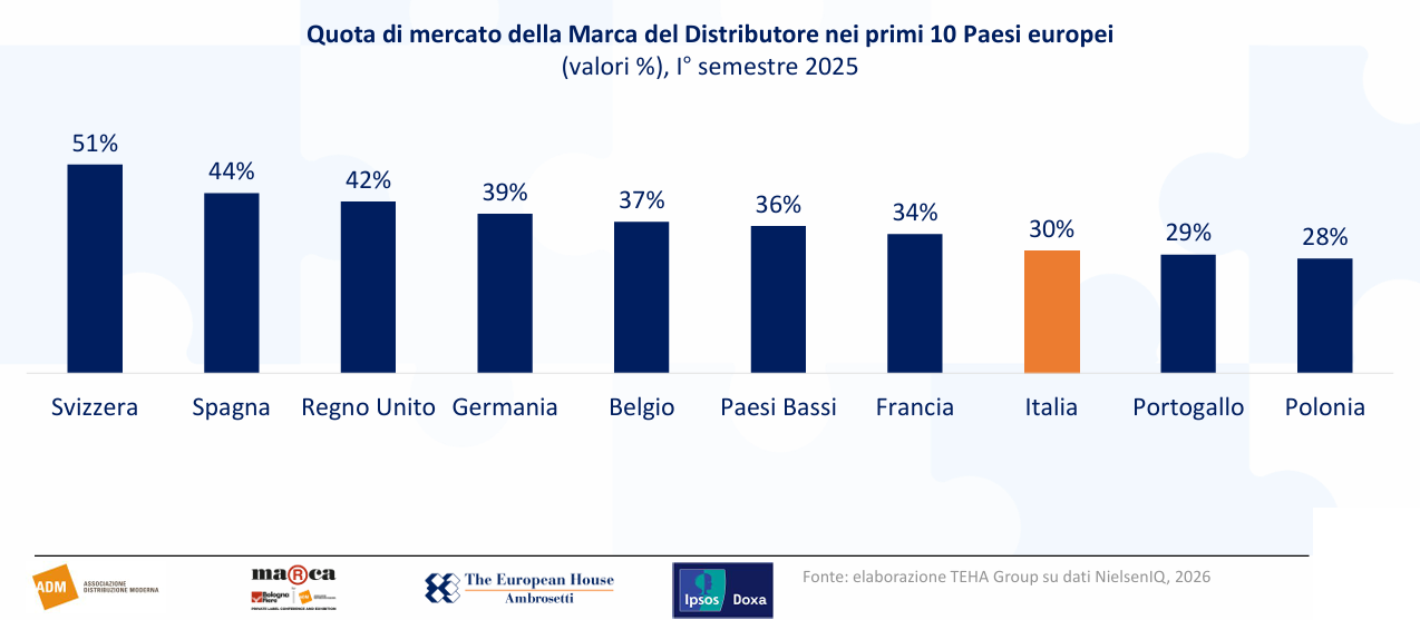Nel confronto europeo, invece, l’Italia mostra ancora un significativo ritardo: nel primo semestre 2025 la quota di mercato della Mdd nel nostro Paese è indicata al 30%, inferiore a mercati come Svizzera (51%), Spagna (44%), Regno Unito (42%) e Germania (39%), ma in un cluster comunque ormai vicino a Francia (34%) e Paesi Bassi (36%). Un dato che, letto insieme alla crescita registrata negli ultimi anni, suggerisce una dinamica ancora espansiva.