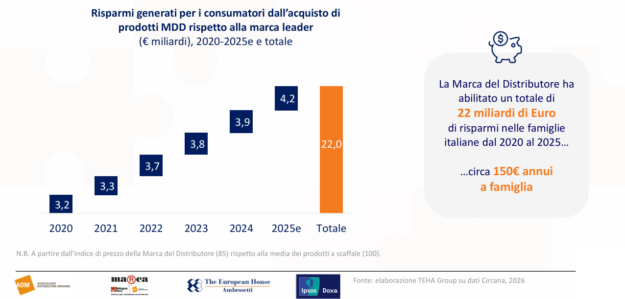 La convenienza resta tuttavia un pilastro cruciale e viene quantificata in termini macro: dal 2020 al 2025 la Mdd avrebbe generato 22 miliardi di euro di risparmi per le famiglie italiane, equivalenti a circa 150 euro annui per nucleo familiare, calcolati sulla base di un indice di prezzo della marca del distributore (85) rispetto alla media dei prodotti a scaffale (100). Questa relazione con il consumatore si costruisce anche attraverso attributi percepiti che superano il semplice “prezzo”: nelle rilevazioni Teha/Ipsos, l’81% degli intervistati è d’accordo sul fatto che le marche del distributore dimostrino attenzione alle esigenze specifiche dei consumatori, l’80% ritiene che la Mdd contribuisca a rendere accessibili a tutti prodotti di qualità e il 70% associa i prodotti Mdd a una scelta responsabile e sostenibile per l’ambiente.