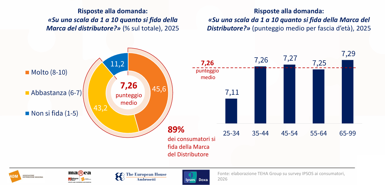 Non a caso, nel comunicato diffuso in occasione dell’evento, Adm sottolinea che «la fiducia è il risultato di un rapporto dinamico» e che il consumatore “informato, esigente e reattivo” si attende flessibilità e capacità di ascolto continuo, mentre Teha evidenzia come la marca del distributore “rifletta in modo diretto e trasparente i valori dell’insegna” e si configuri sempre più come scelta non solo di convenienza ma anche “valoriale”.
