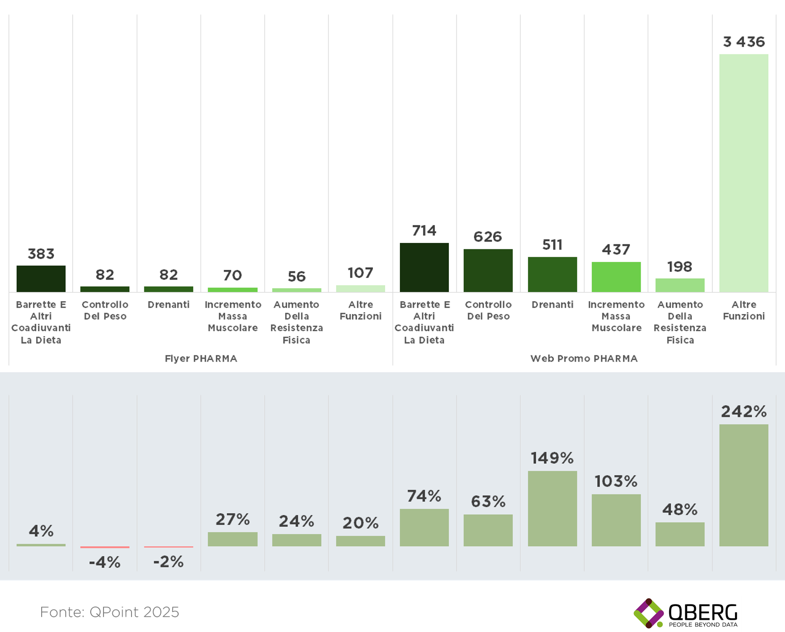 La fotografia arriva dall’analisi che QBerg ha condotto per individuare le scelte promozionali e le strategie di pricing perseguite da farmacie tradizionali e digitali per sostenere questa categoria di prodotti. L’indagine, in particolare, ha censito contenuti e offerte dei volantini e delle campagne web relativi ai dodici mesi che vanno da settembre 2024 ad agosto 2025, confrontati con le uscite del periodo subito precedente (settembre 2023-agosto 2024).