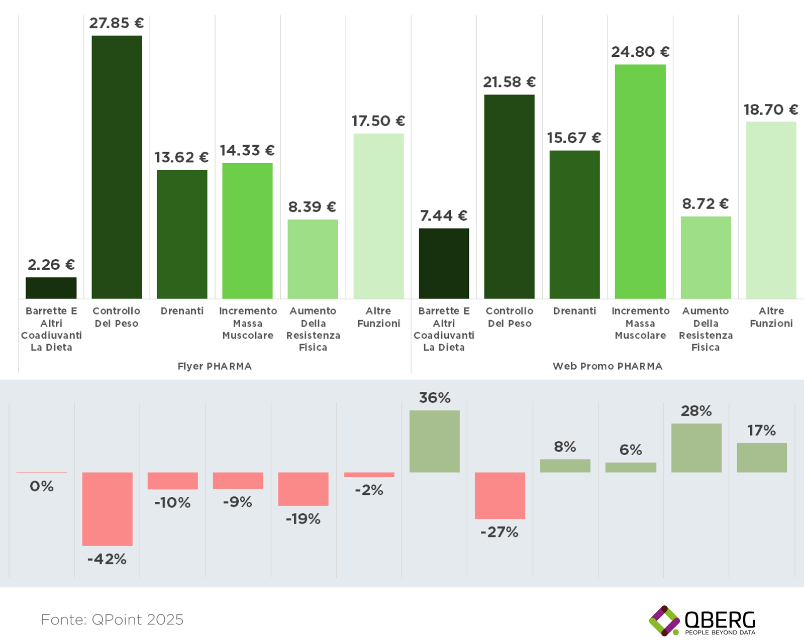 La prima evidenza che emerge dal confronto riguarda i prezzi: il canale fisico della farmacia, forse per i suoi volantini già cari, nel 2025 ha ridotto i prezzi delle promozioni su pieghevole in maniera marcata e per tutti i segmenti: aumento della resistenza fisica (-19%), controllo del peso (-42%), drenanti e incremento della massa muscolare (-9%). Ciò nonostante, le campagne Web continuano anche nell’ultimo anno a distinguersi per i prezzi decisamente più concorrenziali, che confermano e addirittura incrementano la leadership delle promo digitali su quelle cartacee.
