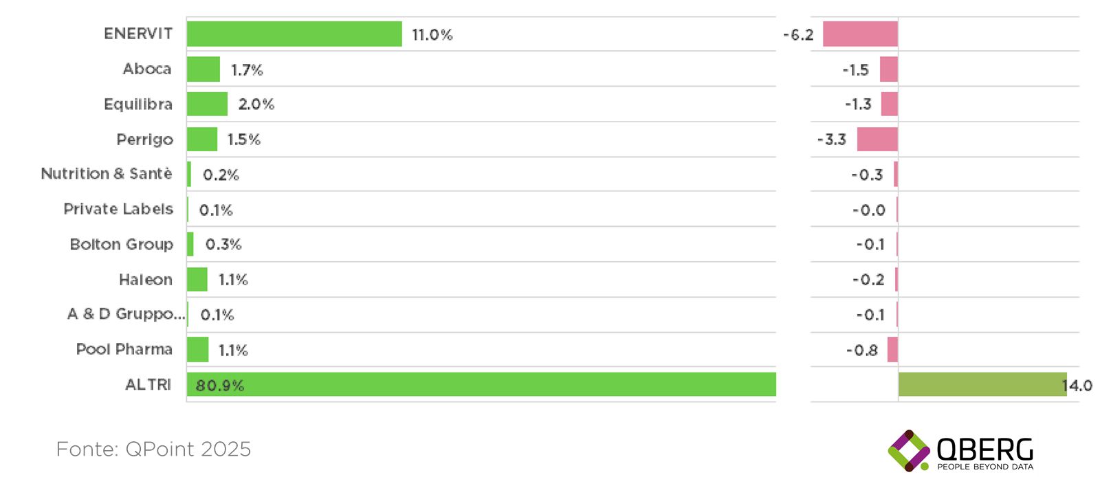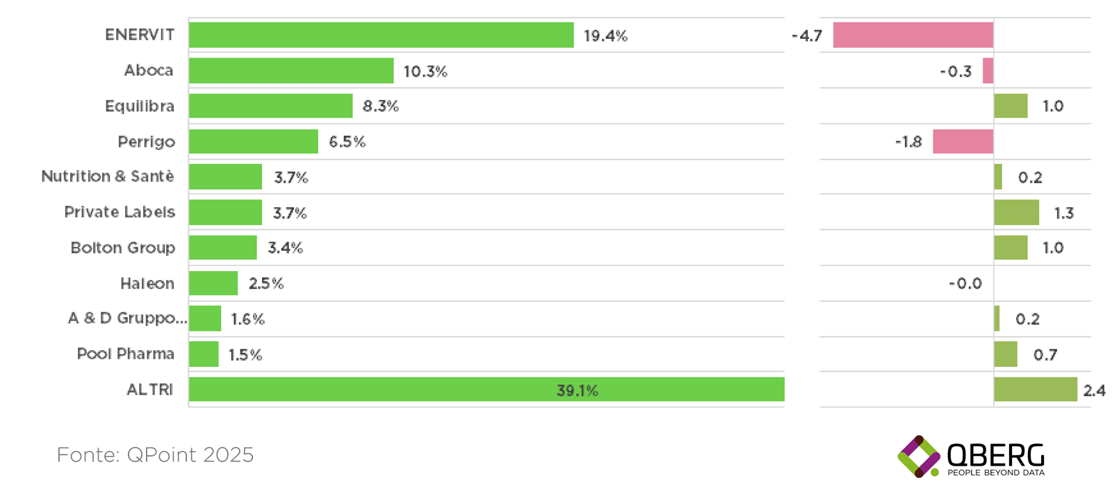 Il cospicuo incremento delle referenze promozionate nell’ultimo anno da volantini e campagne web ha ovviamente modificato le quote di visibilità promozionale dei diversi produttori (circa 800 tra canale fisico e online). Tra i volantini, in particolare, i primi dieci produttori totalizzano una visibilità (misurata attraverso l’indicatore QP3) di oltre il 60%; tuttavia, i principali player sono in calo: Enervit (19,4%) perde sette punti rispetto al 2024), idem Perrigo (-1,8%) e Aboca; cresce invece la quota di visibilità dei brand minori, che crescono anche se con incrementi marginali (meno dell’1%).