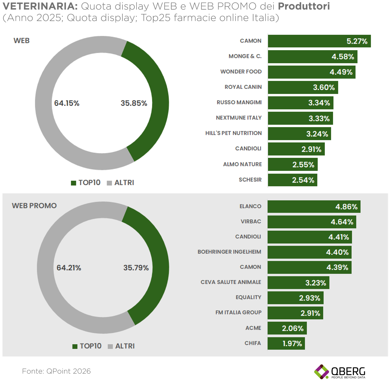 L’analisi dei produttori restituisce un quadro altrettanto significativo, e per certi versi sorprendente. Il livello di concentrazione è pressoché identico nei due canali: sullo scaffale web e nelle Web Promo, i 10 principali produttori per quota di visibilità sommano circa il 36%. Fin qui, la simmetria è quasi perfetta.