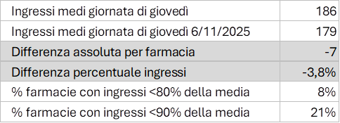 In termini di ingressi, il primo sciopero nazionale dei dipendenti di farmacia del 6 novembre scorso ha avuto effetti limitati per il canale nel suo complesso, ma significativi per una parte dei punti vendita. Questa almeno è la constatazione cui invita l’analisi condotta per Pharmacy Scanner da New Line Ricerche di Mercato sulla base degli scontrini emessi nella giornata dell’agitazione dal suo campione di riferimento per il tracking giornaliero, composto da novemila farmacie e rappresentativo del comparto su scala nazionale. Sia chiaro, i dati che ne discendono non vanno intesi come un “proxy” (un indicatore sostitutivo) per misurare il tasso di adesione allo sciopero da parte dei collaboratori oppure la quota di esercizi costretti a chiudere per mancanza di personale. Ci penseranno i sindacati delle due parti, sempre se lo vorranno fare, a fornire cifre al riguardo. Quello che invece abbiamo voluto fare, piuttosto, è valutare il comportamento del pubblico nella specifica giornata considerato che nella settimana precedente lo sciopero ha avuto ampia copertura sui media nazionali e locali.