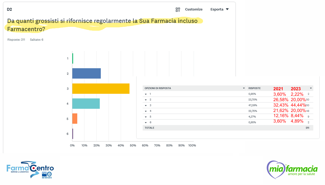 Oltre a misurare il gradimento delle farmacie per i servizi della cooperativa, la survey ha contato il numero di distributori (oltre a Farmacentro, ovviamente) da cui ogni titolare si serve regolarmente. Su un totale di 211 intervistati, quasi uno su due ha risposto indicando in tre i propri grossisti abituali, poco meno del 24% ha detto due e quasi il 23% ha risposto quattro. Ma più dei risultati in sé colpisce l’evoluzione negli anni: nella survey condotta da Farmacentro nel 2021 solo un farmacista su tre dichiarava di servirsi da tre distributori, mentre più del 12% diceva di averne 5 (oggi rispondono allo stesso modo poco più del 4% degli intervistati). Due anni dopo, sempre nello stesso genere di survey, i farmacisti che affermano di avere tre grossisti diventano il 44%, quelli che ne hanno 2 o 4 calano al 20% e quelli che ne tengono 5 scendono all’8%.